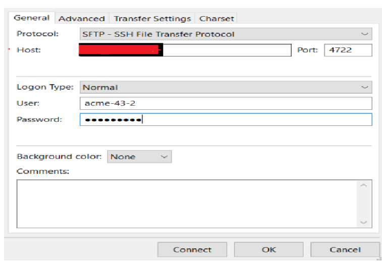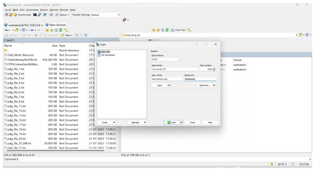 In the File Transfer client, provide the Data Gateway Host, Port and the username, password which was used during the Endpoint setup and connect.