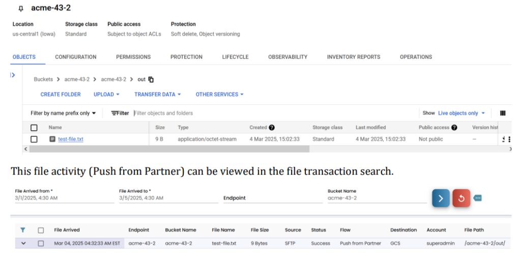 In case of the other direction, when the file is available in the cloud bucket to be sent to Partner’s Remote Server, it will be sent immediately based on the cloud event trigger configuration, it is considered as Push to Partner.