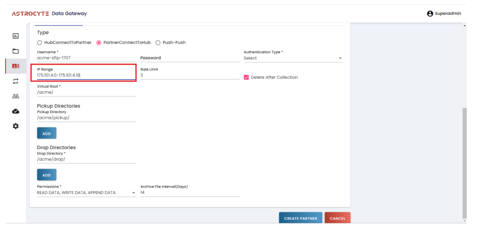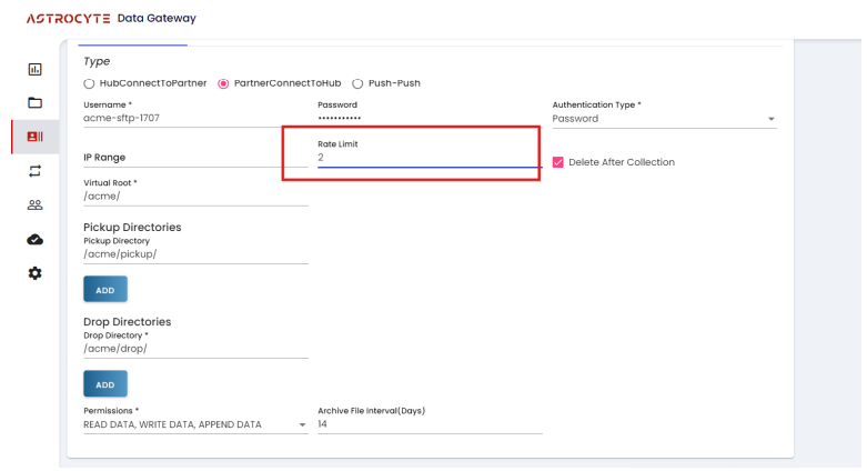 Example:- If the polling interval is 2 Minutes, for every 2 minutes connection with the remote partner server is established and if there are any files in the pickup directories they will be picked and moved to the respective cloud storage, it is considered as Pull from Partner.